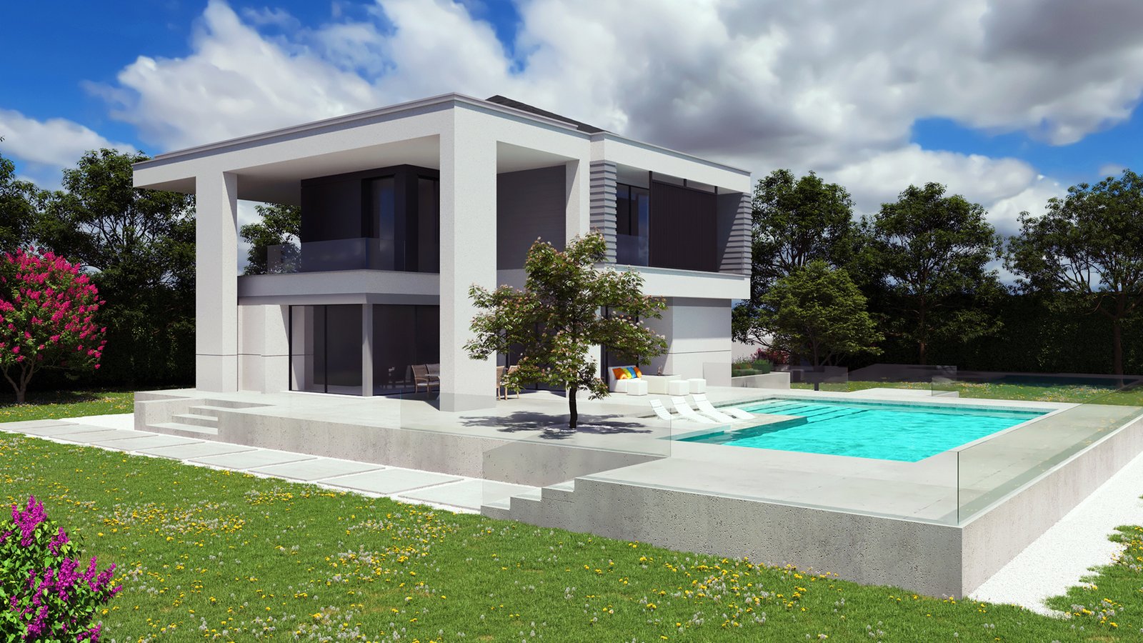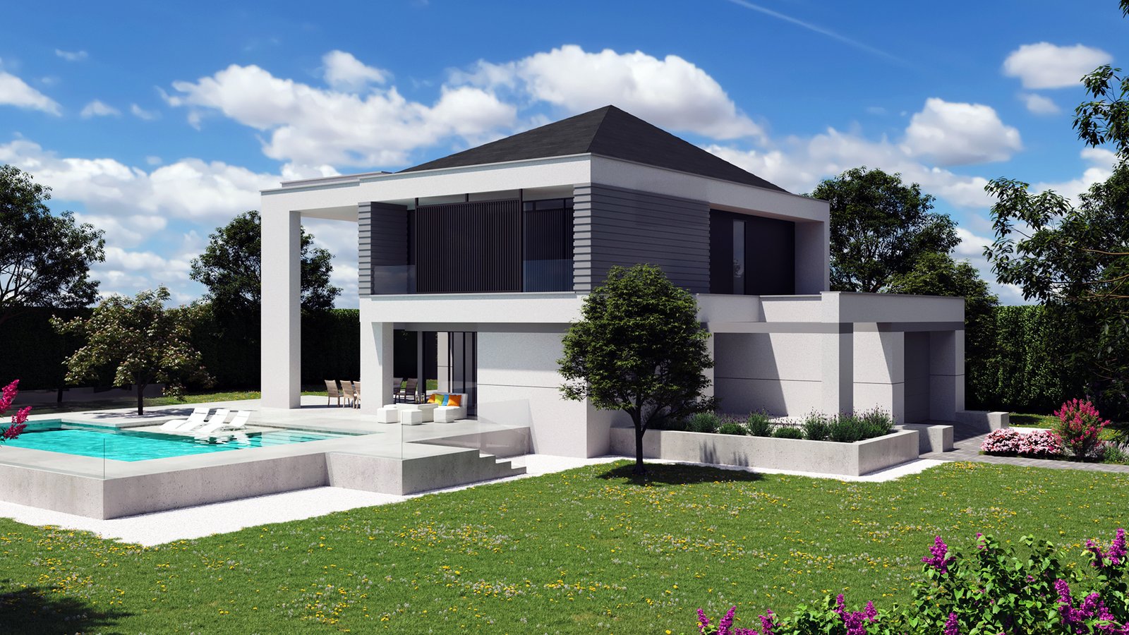 Se propuso un diseño de vivienda libre para la venta de una parcela de 400m2. La propuesta de este diseño consistió en una vivienda de dos plantas, de arquitectura moderna, con piscina exterior y ajardinamiento en todo su perímetro.